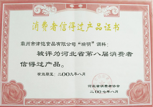 公司2007年8月被評為河北省第八屆消費者信得過產(chǎn)品