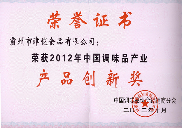 公司2012年10月榮獲2012年中國調(diào)味品產(chǎn)業(yè)產(chǎn)品創(chuàng)新獎