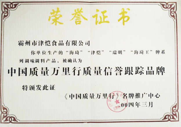 公司2004年3月生產(chǎn)“海琦王”調(diào)料被確認為中國質(zhì)量萬里行質(zhì)量信譽跟蹤品牌