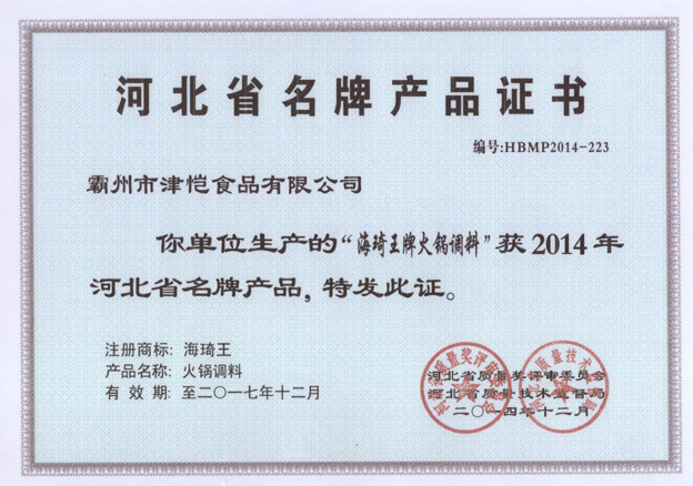 公司2014年12月“海琦王牌火鍋調(diào)料”獲2014年河北省名牌產(chǎn)品