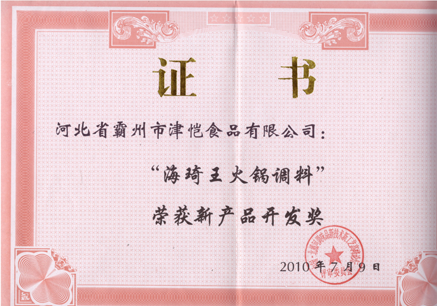 公司2012年9月“復(fù)合調(diào)味品火鍋蘸料系列產(chǎn)品”榮獲新技術(shù)創(chuàng)新獎
